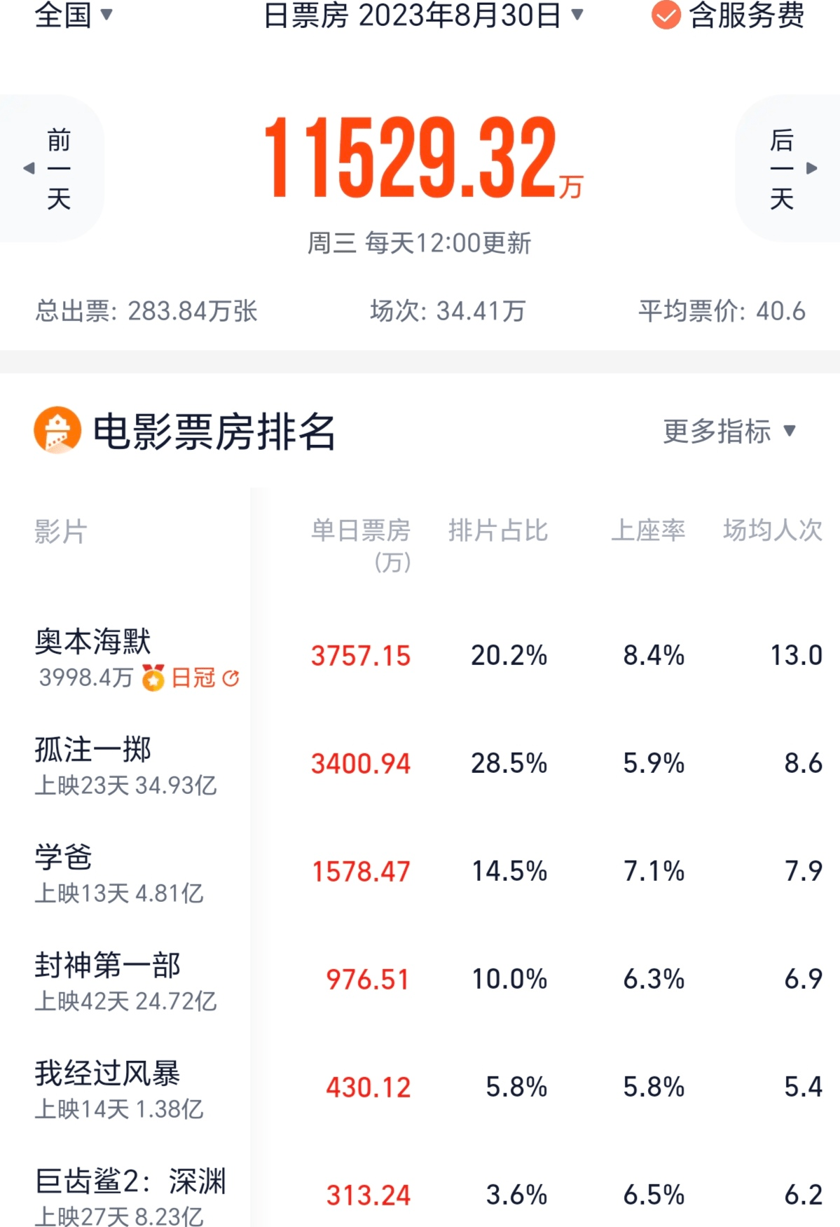 《奥本海默》上映后,大热国产片《孤注一掷》被挤到了第二。不过,这部片依然强势,排片占比遥遥领先,上映23天累计票房近35亿元,最终可能冲39亿元。
