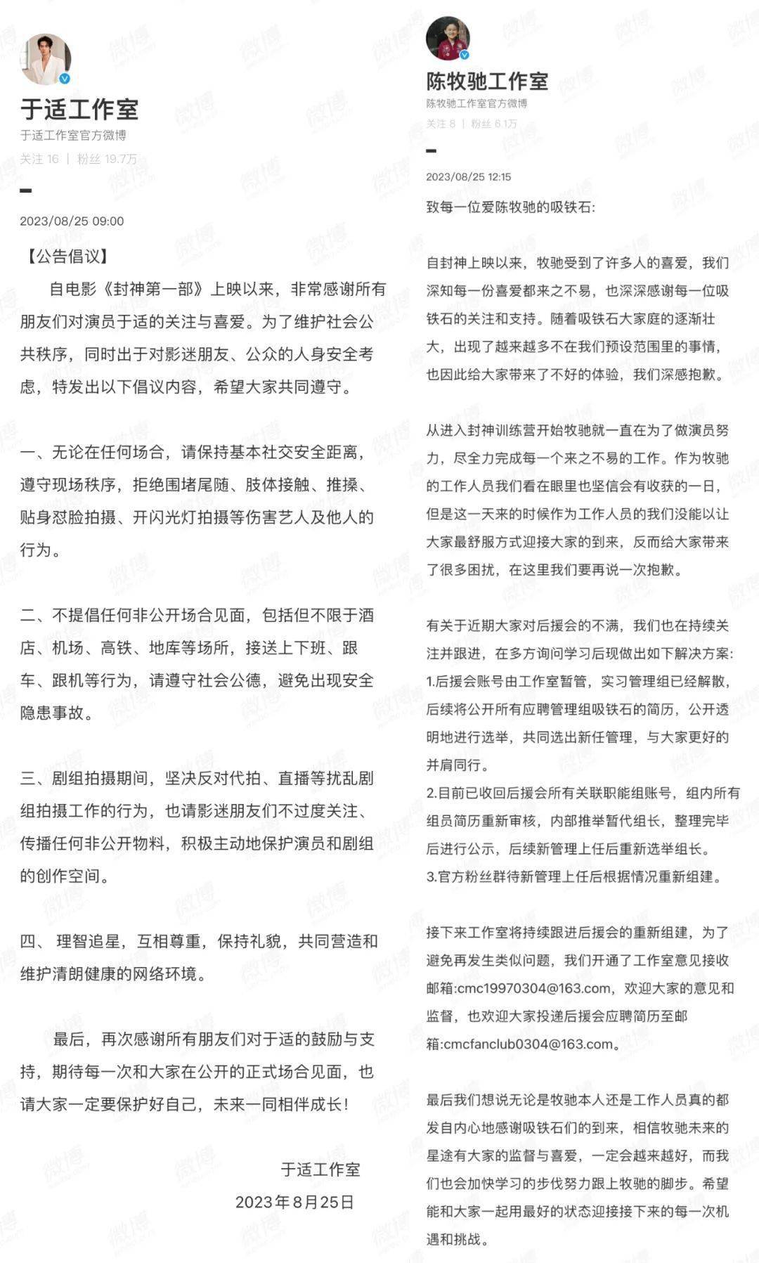 随着路演粉丝的数量越来越多,在《封神第一部》中饰演姬发的于适,通过工作室发布了《公告倡议》,明确“不提倡任何非公开场合见面”“剧组拍摄期间反对代拍”“理智追星”等诉求;殷郊的扮演者陈牧驰,也在粉丝的要求下开始调整“后援会”等组织。