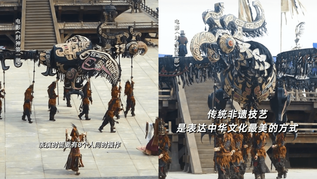 影片中很多看似电脑特效构建的画面,实际上都是实物道具拍摄。比如殷寿登基大典那一段戏,硕大无比的玄鸟模型令人印象深刻。玄鸟的骨架,由潍坊的一位风筝非遗传人制作。