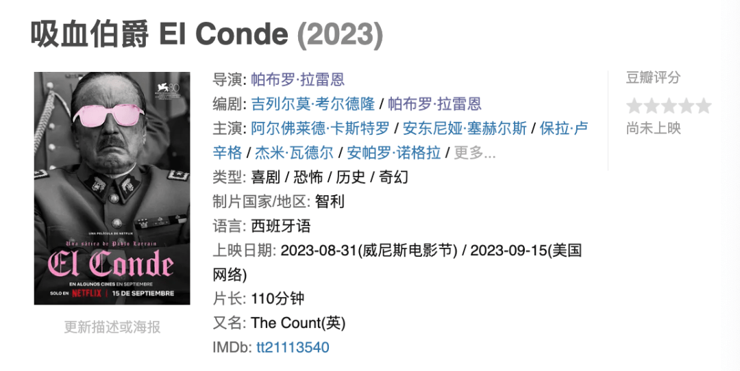 剧情简介转自豆瓣:故事围绕智利独裁者奥古斯托·皮诺切特展开,他并没有死,而是成为了吸血鬼。在这个世界上呆了250年之后,自身耻辱以及家庭冲突所带来的疾病,令他决定永远地死去。
