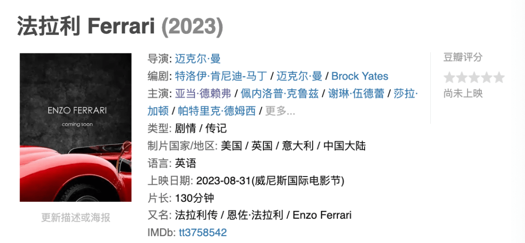 老导演迈克尔·曼执导的《法拉利》传记片,亚当·德赖弗主演,其他还包括佩内洛普·克鲁兹、谢琳·伍德蕾、莎拉·加顿、帕特里克·德姆西等人。
