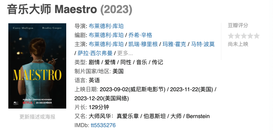 据说这一部将不会关注伯恩斯坦的音乐成就,专注于他与妻子的感情故事。