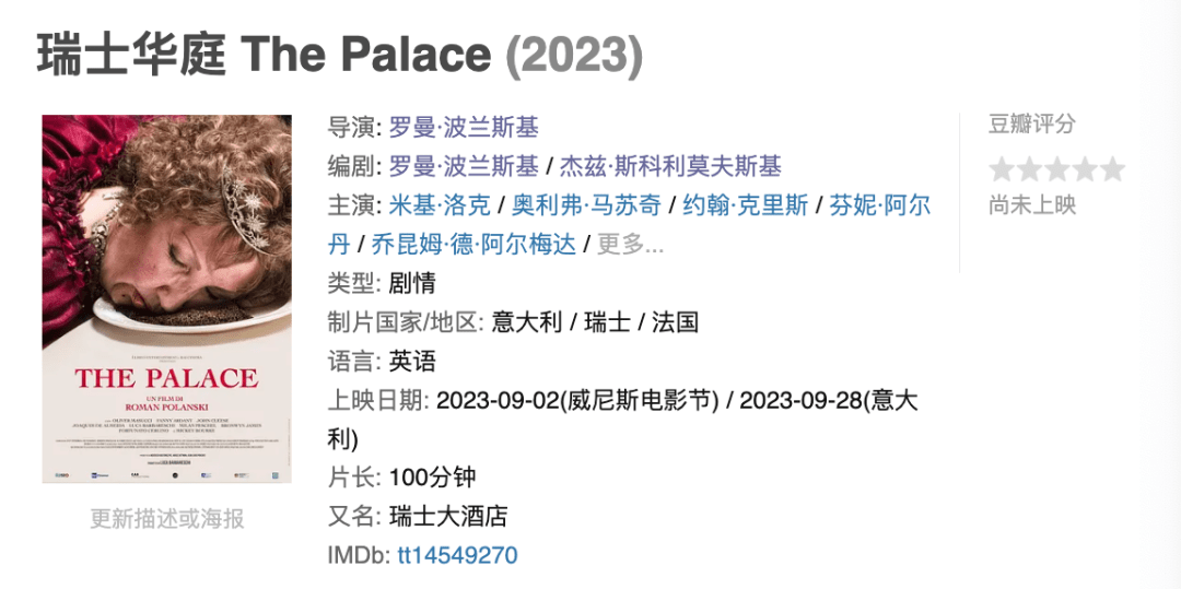 罗曼·波兰斯基将执导新片[瑞士华庭](The Palace,暂译)。波兰斯基与波兰名导杰兹·斯科利莫夫斯基共同执笔剧本,故事设定在1999年的最后一天跨年夜,描绘了位于瑞士阿尔卑斯山的大酒店里,来宾和为他们工作的人们之间的生活交集。影片将是波兰斯基对千禧年的一个结语。