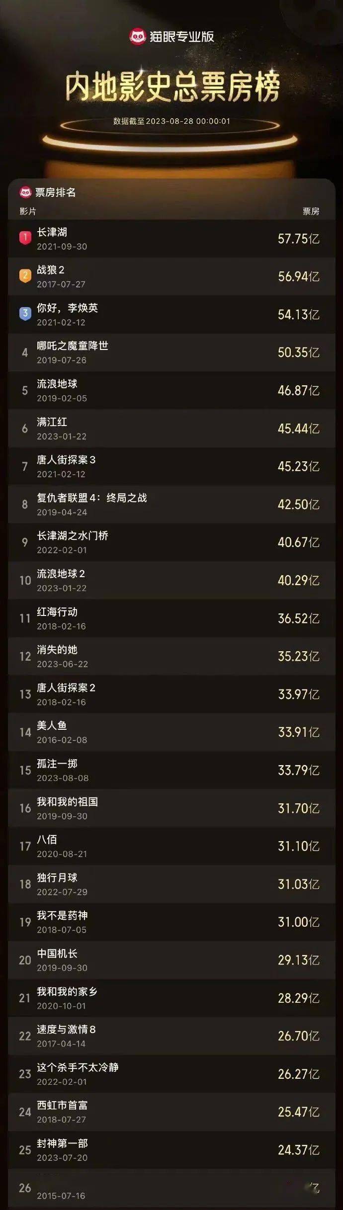 《孤注一掷》进入影史票房榜前十三