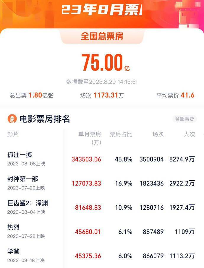 截至8月29日14时,2023年8月总票房突破75亿,《巨齿鲨2》累计总票房8.16亿,暂居2023年8月票房榜第三位。
