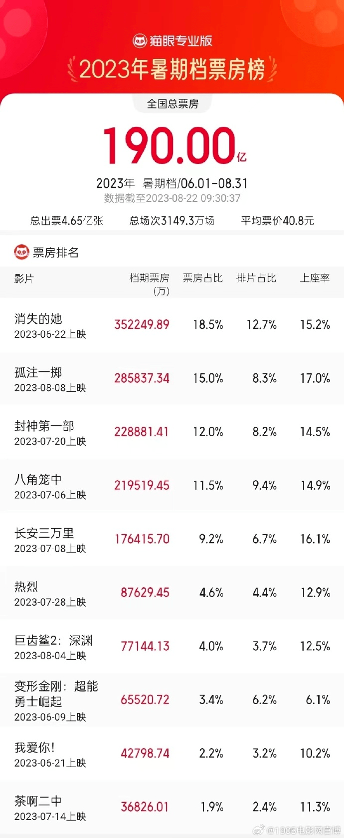 截至8月22日9时30分,2023年暑期档总票房(含预售)破190亿,《消失的她》《孤注一掷》《封神第一部》《八角笼中》《长安三万里》分列暑期档票房前五。