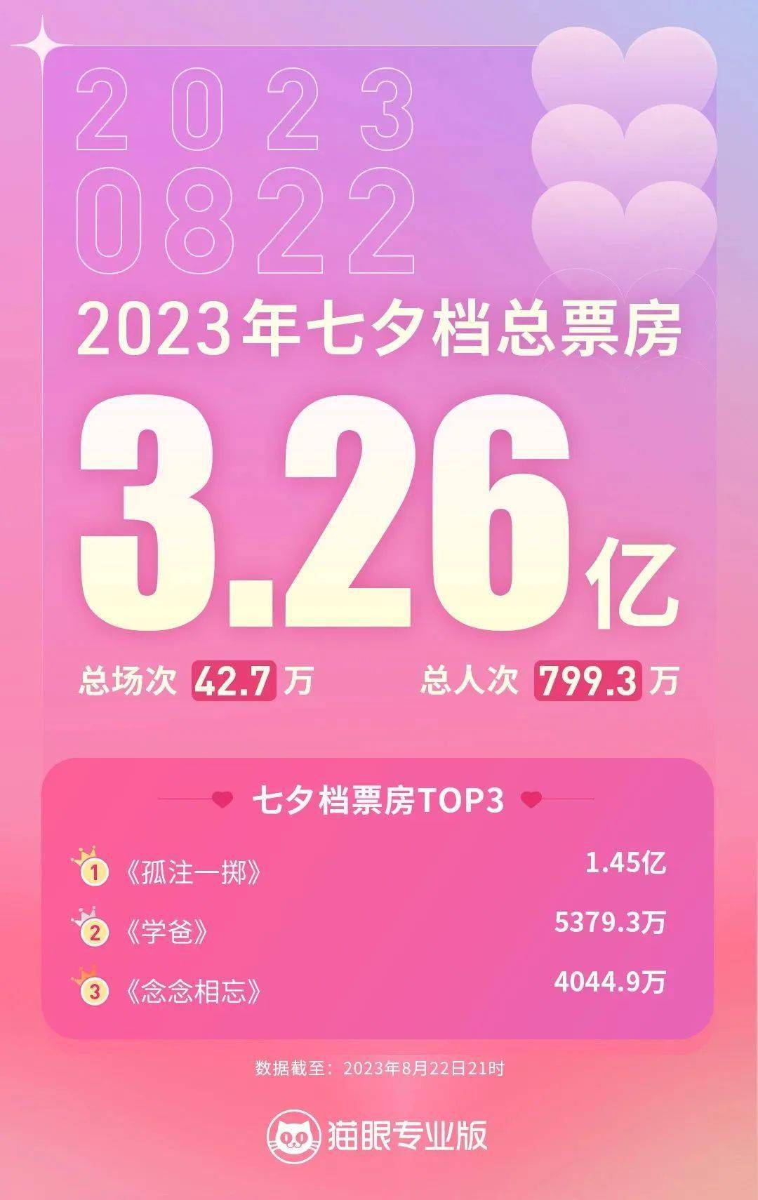 据猫眼专业版数据,截至8月22日21点,2023年七夕档(8月22日)总票房(含预售)突破3.26亿,《孤注一掷》《学爸》《念念相忘》暂列七夕档票房榜前三名。