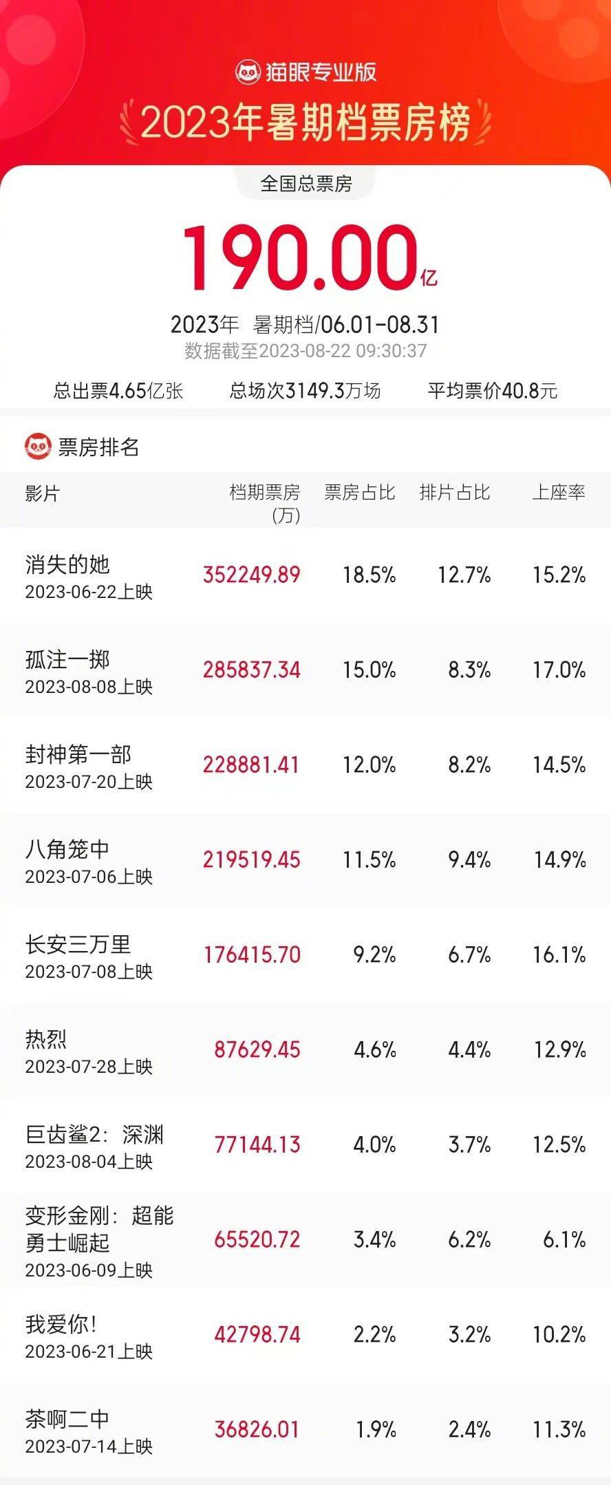 原标题:2023暑期档票房破190亿!《消失的她》暂居榜首