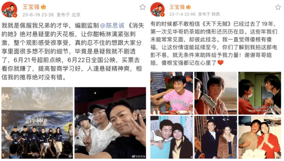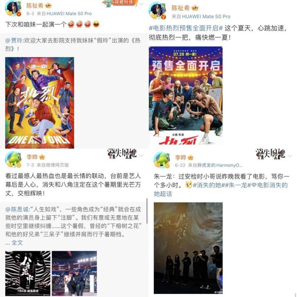 最后是影人互相之间真情流露的联动。如果个人账号只是拿来当“第二个官方账号”,仅用于转发一些传统物料,那实际上没有太大意义。但这些暑期档影人在微博上,经常展露出自己真情流露的一面,完全是生动的“内娱活人”。