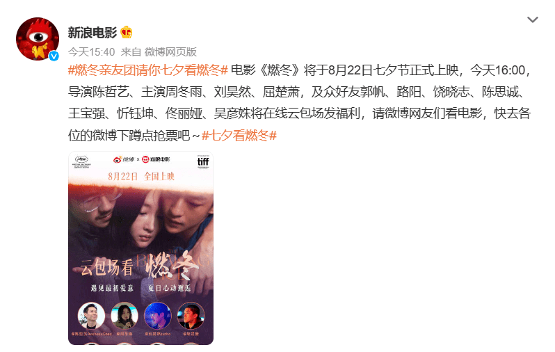 定于七夕上映的《燃冬》今天也开启了云包场的活动。在#燃冬亲友团请你七夕看燃冬#的话题下,无数圈内知名影人通过云包场的方式请微博网友们看电影。这样的“团建场面”屡屡出现,让微博仿佛成为了电影人的朋友圈。