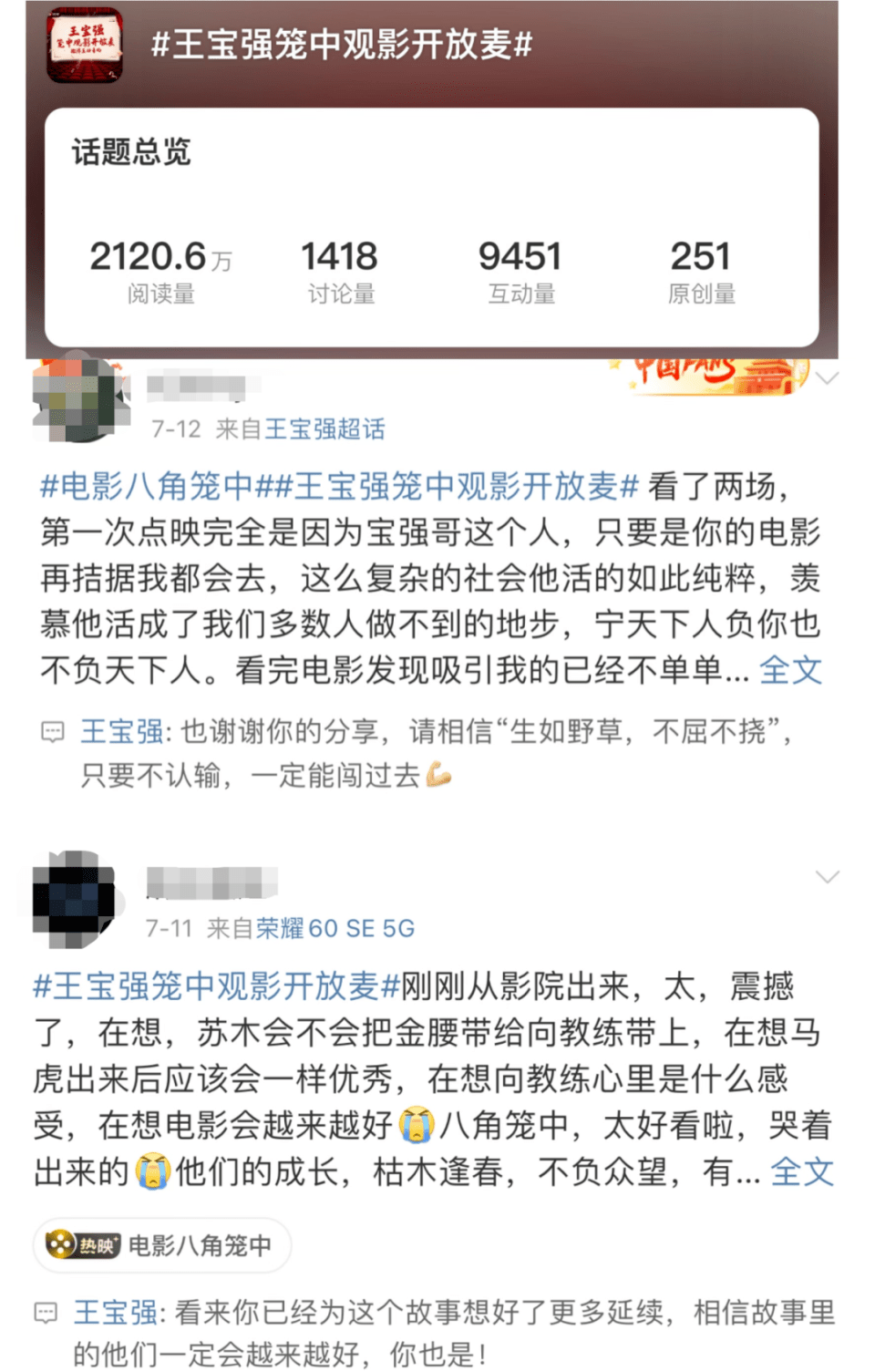 除了单方面的发布之外,新时代媒介的重要价值更在于互动性。比如微博给《八角笼中》设置了#王宝强笼中观影开放麦#的话题,让用户能够集中分享观影感受,王宝强本人也亲自回复了其中的一些评价。