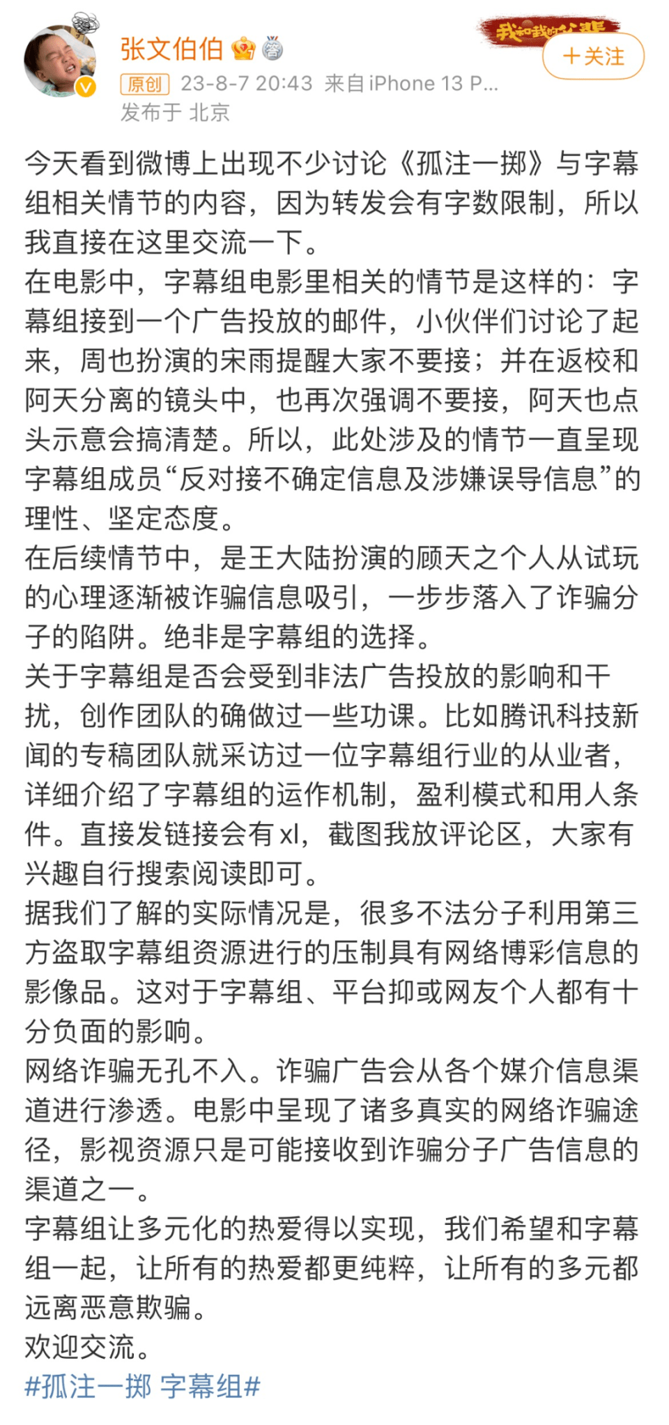 以《孤注一掷》为例,影片中关于字幕组角色的设置受到了争议,张文伯第一时间在个人账号上撰写了长文进行回复,“创作团队的确做过一些功课。”在长文发布之后,这一话题登上了热搜,引导更多的网友正确理解字幕组与非法信息之间的关系。整个暑期档都在热议的“点映”和“路演”等话题,张文伯也在直播连麦当中与其他博主一同讨论、分享了自己的看法。