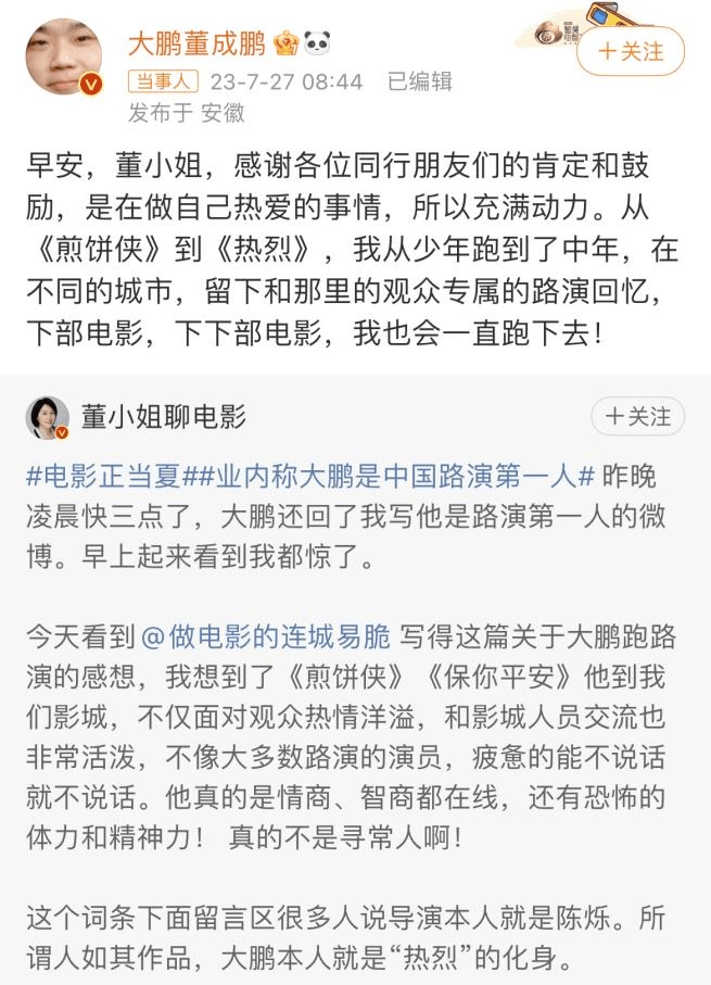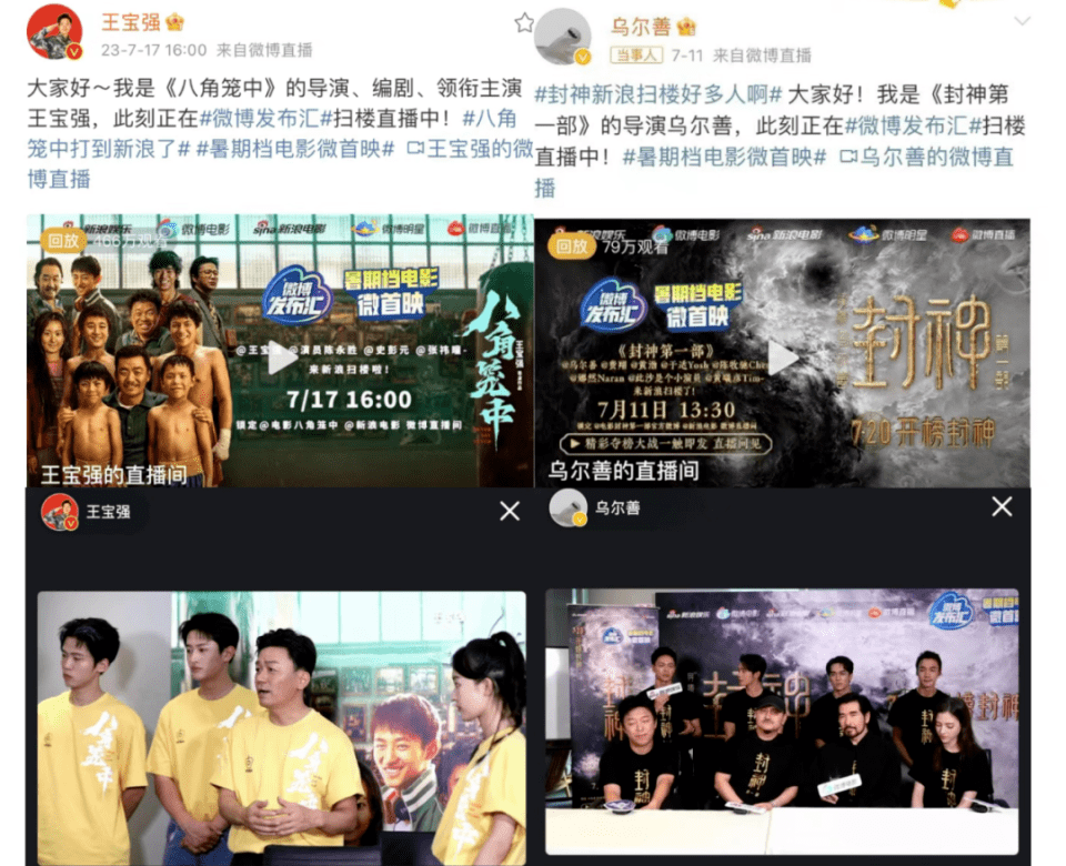 微博试图通过这样有传播力的方式,引导网友更多关注电影行业的幕后英雄。在今年暑期档,除了导演们之外,《封神第一部》的编剧冉平、冉甲男,《热烈》的编剧苏亮、《消失的她》策划李晔等幕后影人,也都在微博上聆听网友的观影感受,分享自己的心路历程。