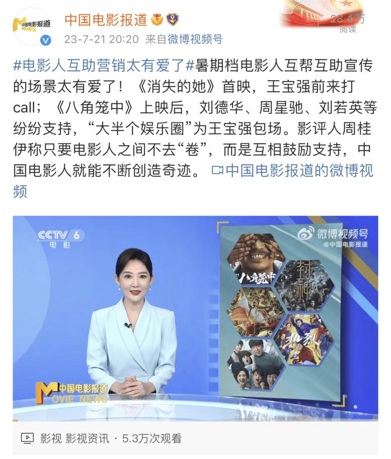不同影片之间的联动,则更加抬升了暑期档整体的热度。比如王宝强与陈思诚互相为对方的电影做宣传,《八角笼中》《封神第一部》《学爸》也有联动海报。类似#电影人互助营销太有爱了#这样的话题甚至还登上了热搜,给普通观众传递行业互助的积极印象。