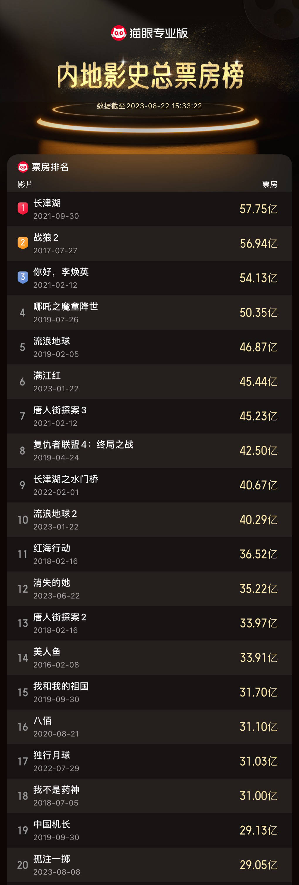 搜狐娱乐讯 据猫眼专业版数据,截至8月22日14:59,宁浩监制,申奥执导,张艺兴、金晨、咏梅、王传君、王大陆、周也、孙阳主演的反诈题材电影《孤注一掷》上映第15天 ,累计票房破29亿,跻身中国影史票房总榜前二十,暂居2023年度内地票房榜第四位。