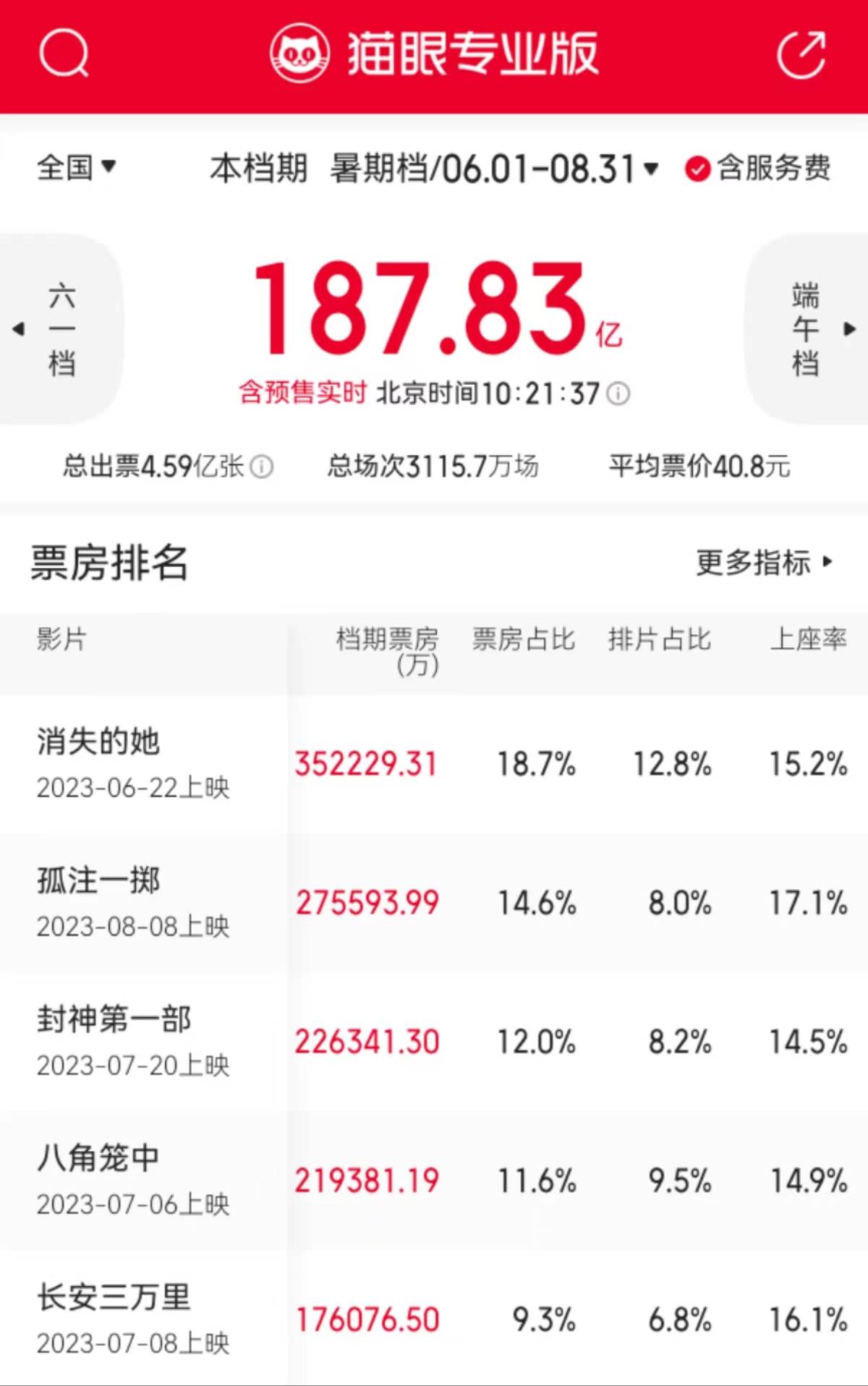 一边是电影市场接连出现《消失的她》《八角笼中》《封神第一部》《孤注一掷》等四部破20亿电影,8月18日暑期档总票房破178亿元,创中国影史同期票房纪录。