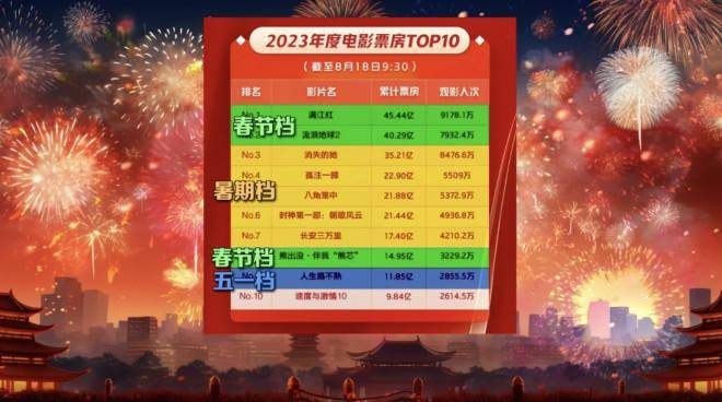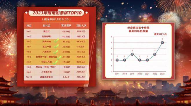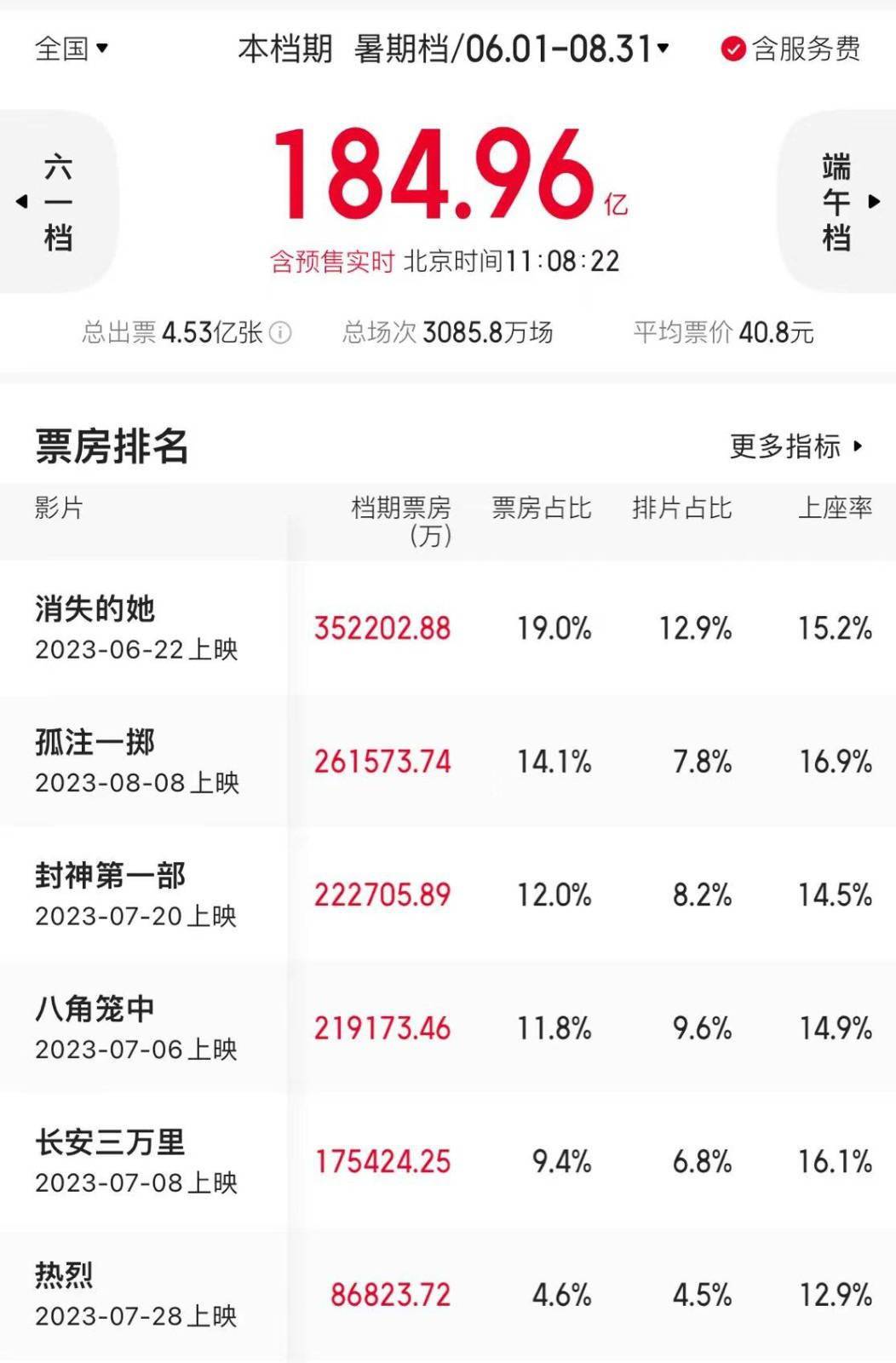 截至2023年8月20日上午11时,暑期档票房已经达到184.96亿。占据此时年度票房406.19亿的45.49%。
