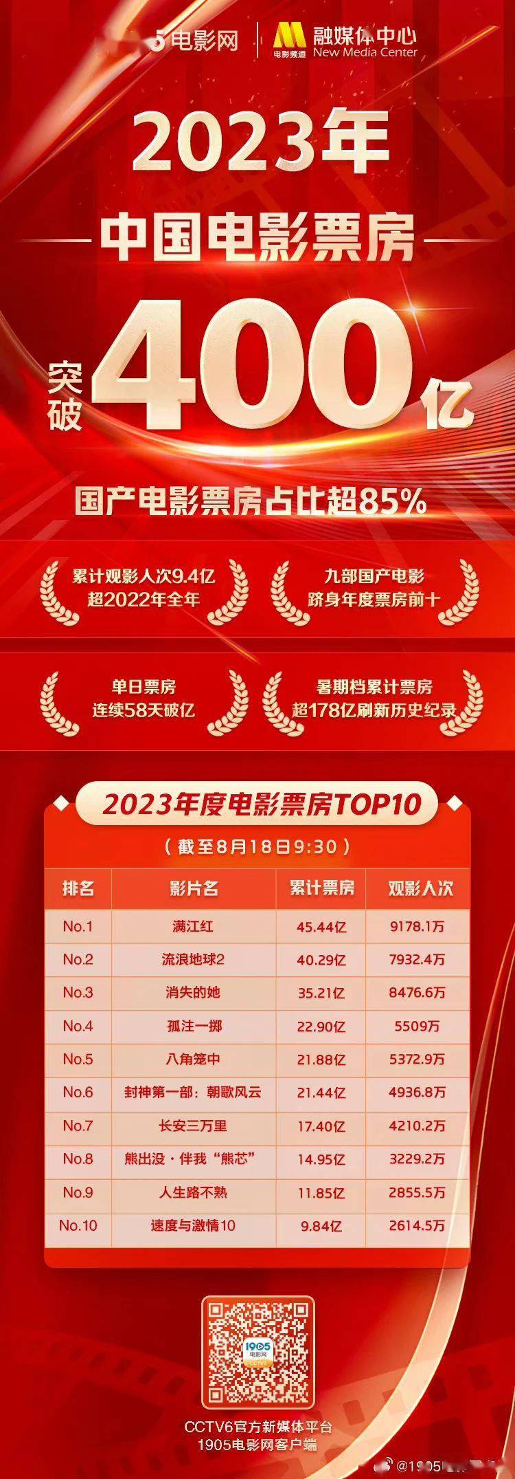 对此,小编估计这2023中国电影票房简直直冲600亿啊,真的是能够感受到电影院的饱满,和电影市场的复苏,让我们共同期待中国电影更加漂亮的答卷!