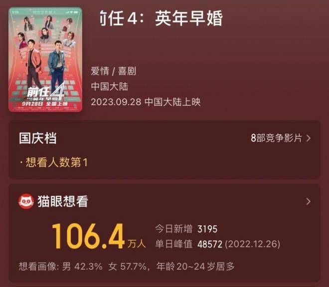 9月28日即将上映的《前任4:英年早婚》猫眼想看人数高达106万,还未上映累计上榜热搜话题就已有135个。