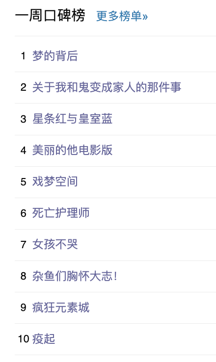 最后,还是例行附上一周豆瓣口碑榜的完整榜单: