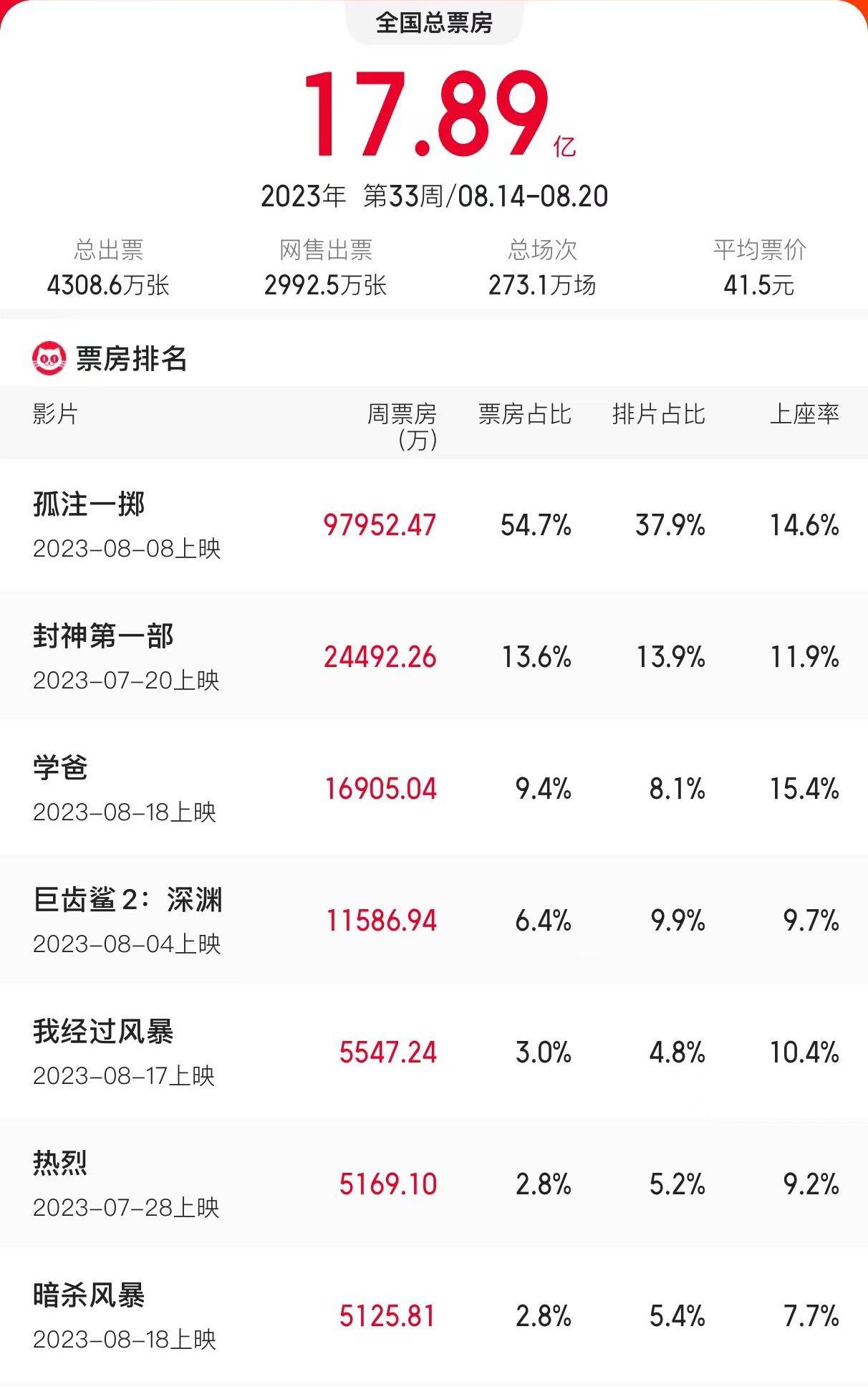原标题:8.14-8.20内地一周票房17.89亿 《孤注一掷》累计超27亿跃居票房总榜第四