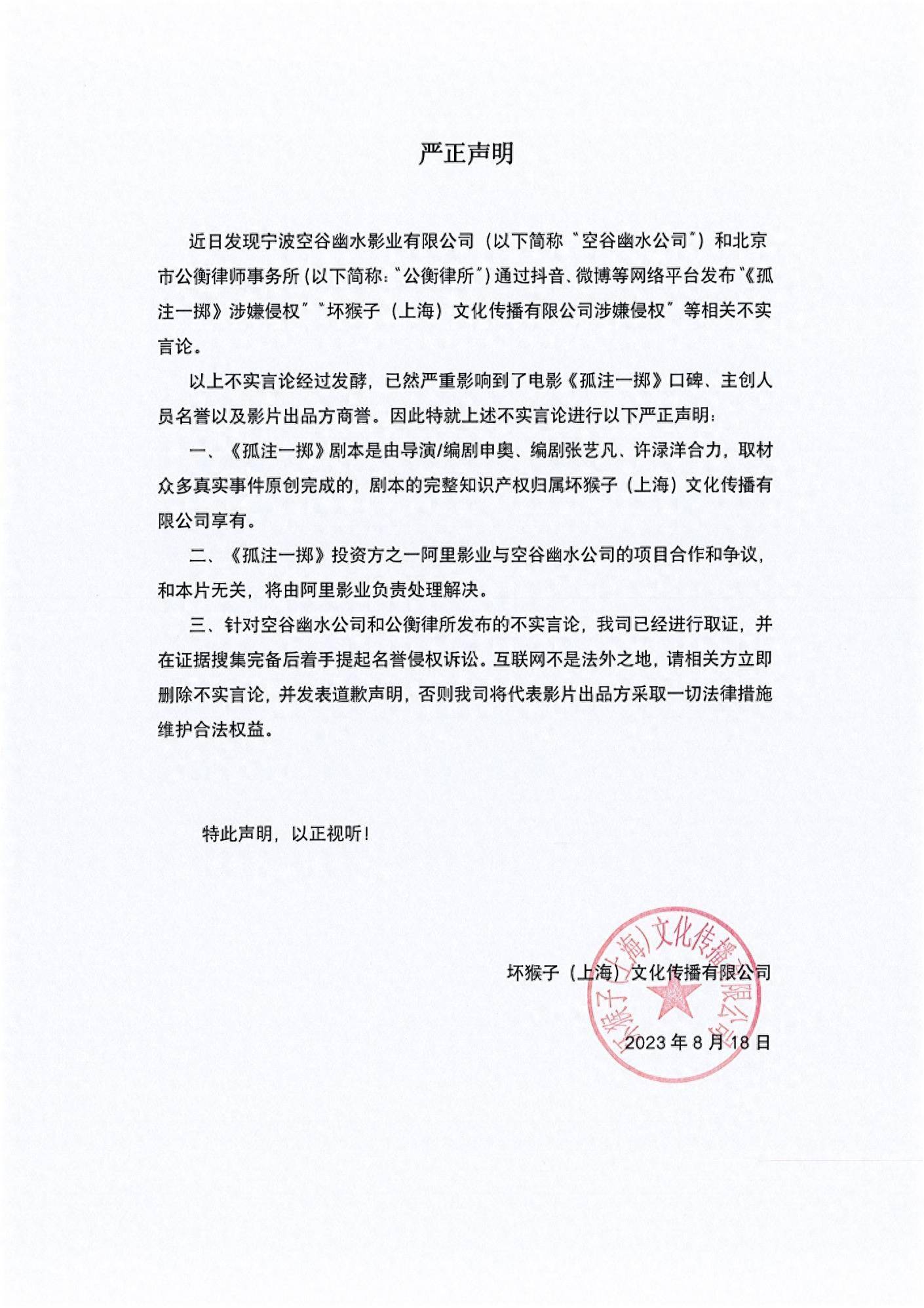 坏猴子影业发布声明表示,《孤注一掷》剧本是由导演/编剧申奥、编剧张艺凡、许渌洋合力,剧本的完整知识产权归属坏猴子(上海)文化传播有限公司享有。坏猴子影业请相关方删除不实言论,并发表道歉声明,否则将代表影片出品方采取一切法律措施维权。