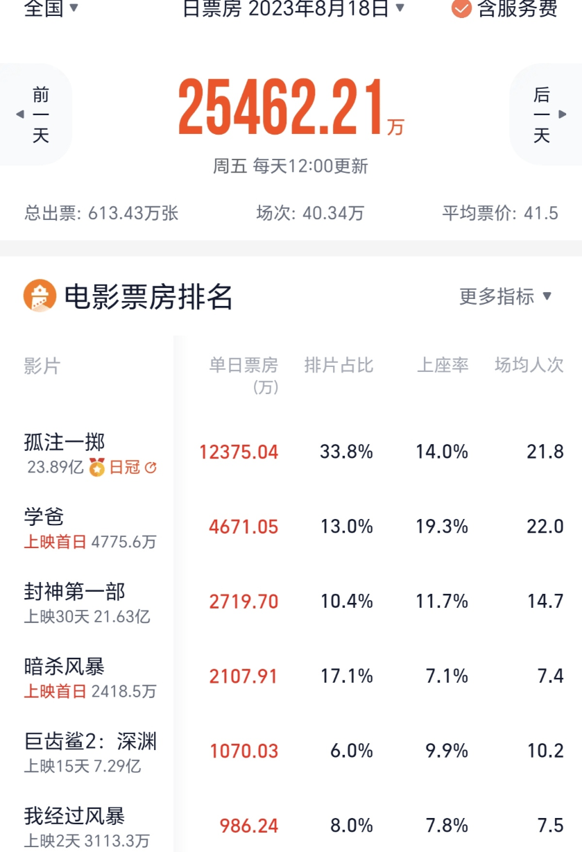 搜狐娱乐讯 (哈麦/文)本周四、周五上映了《我经过风暴》《学爸》《暗杀风暴》三部国产新片,表现最好的是黄渤主演的《学爸》,周五上映首日仅拿到13%的排片,但上座率在所有热门电影里遥遥领先,收票房4700万元,仅次于《孤注一掷》,排在第二。