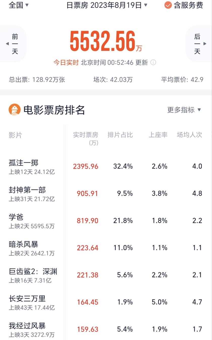 周六,《学爸》开始爆发,预排片占比飙升到了21.8%,预售票房在《孤注一掷》《封神》之后,排第三。相对地,《暗杀风暴》排片跌至11%,《我经过风暴》排片跌至5.4%。