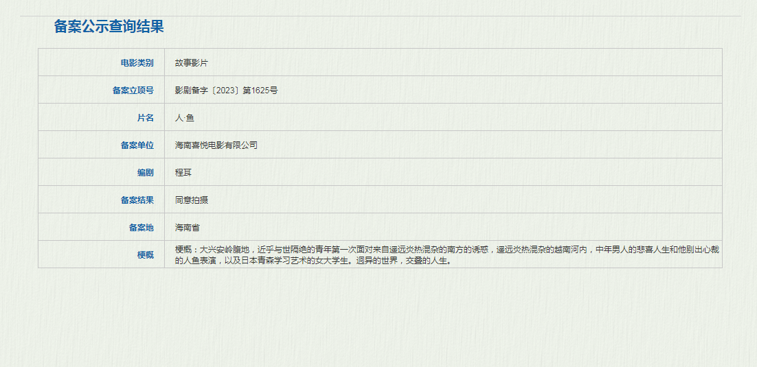 1905电影网讯8月18日,国家电影局发布关于2023年7月上全国电影剧本(梗概)备案、立项公示的通知,由海南喜悦电影有限公司出品的电影《人·鱼》获准拍摄,编剧为程耳。