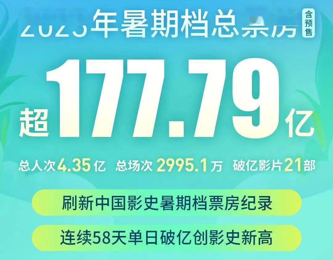 不仅总票房创历史新高,2023暑期档观影总人次达4.35亿,21部影片破亿,连续58天单日破亿创影史纪录,多维度成绩均十分亮眼。
