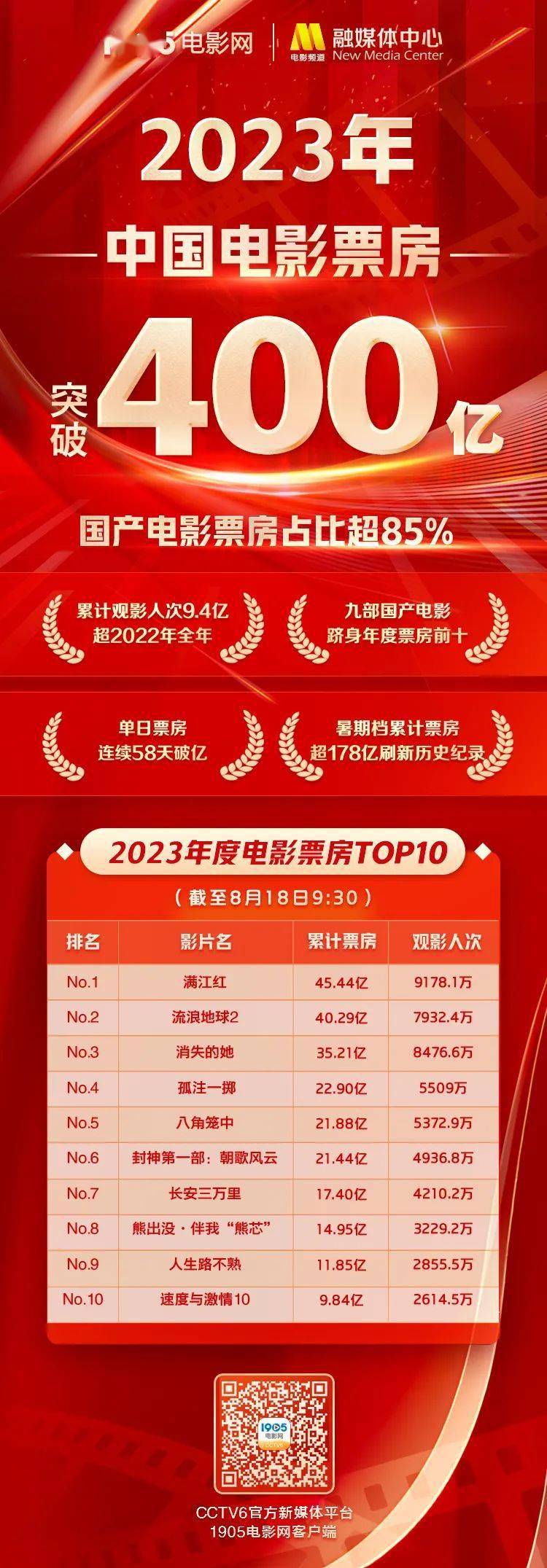 8月18日,2023年总票房突破400亿大关,从300亿(7月14日)到400亿,仅仅用时35天,市场再度见证了中国电影的“速度”!