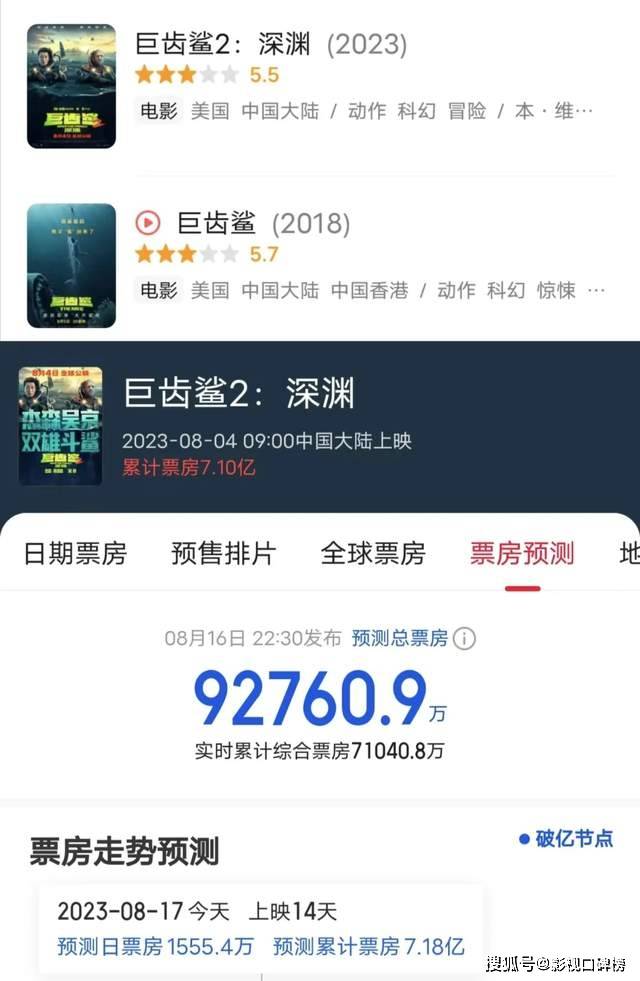 目前《巨齿鲨2》内地的预测总票房只有不到10亿,豆瓣评分也只有5.5分。试图将爆火元素一手抓却只是不费心思的盲目堆砌,特效不足、剧情太水、人设还拉胯的“深海巨制”会被同期选手吊打完全是意料之中。