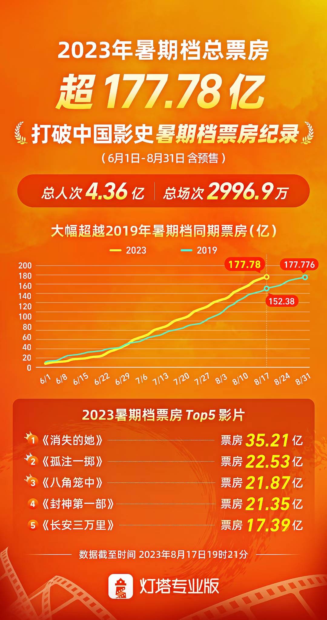 暑期档《消失的她》《孤注一掷》《八角笼中》《封神第一部》《长安三万里》五部电影排进了年度票房榜前十,《热烈》《巨齿鲨2》《我爱你!》《茶啊二中》表现也不错。