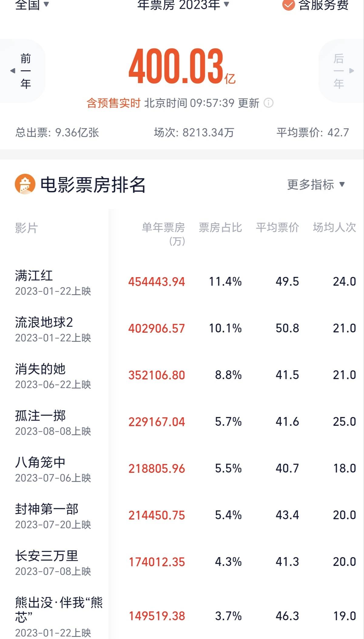 由于暑期档的爆发,2023年累计总票房突破了400亿元。