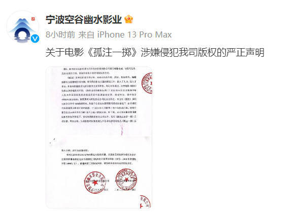 搜狐娱乐讯8月17日,宁波空谷幽水影业在社交平台上发布声明称,电影《孤注一掷》涉嫌侵犯自己公司原创系列电影《捕鱼行动》的版权,已向国家电影局举报并提起诉讼。目前《孤注一掷》片方并未回应。