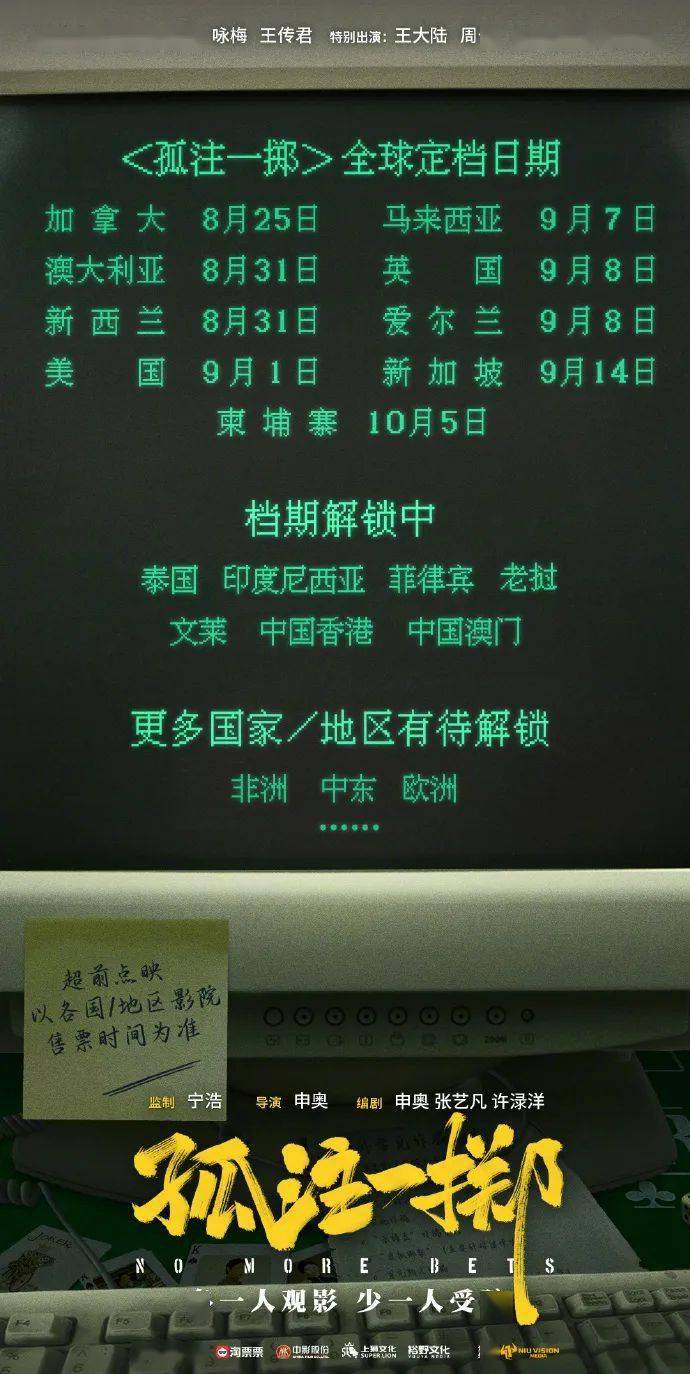 8月17日,电影《孤注一掷》官宣海外九个国家定档日期,将先后在加拿大、澳大利亚、新西兰、美国、马来西亚、英国、爱尔兰、新加坡、柬埔寨等地上映,泰国、印度尼西亚、菲律宾等东南亚地区也同步确认上映,具体档期正在解锁。此外电影还将登陆非洲、中东、欧洲等地大银幕。