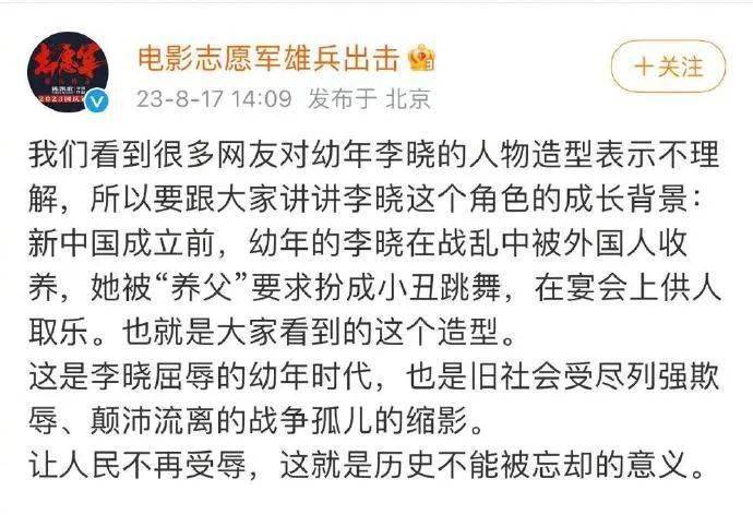 8月17日,电影《志愿军》因片中幼年李晓杀青照引发争议,片方发布回应和致歉声明,“因为我们事先对这个角色及其造型缺乏必要的介绍,在发布后给网友造成了一系列的误解,我们就此诚挚道歉。”
