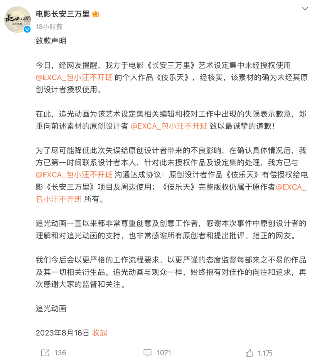 8月17日,电影《长安三万里》 因官方艺术设定集中未经授权使用网友创作的个人作品《伎乐天》,通过电影官微向原作者致歉。