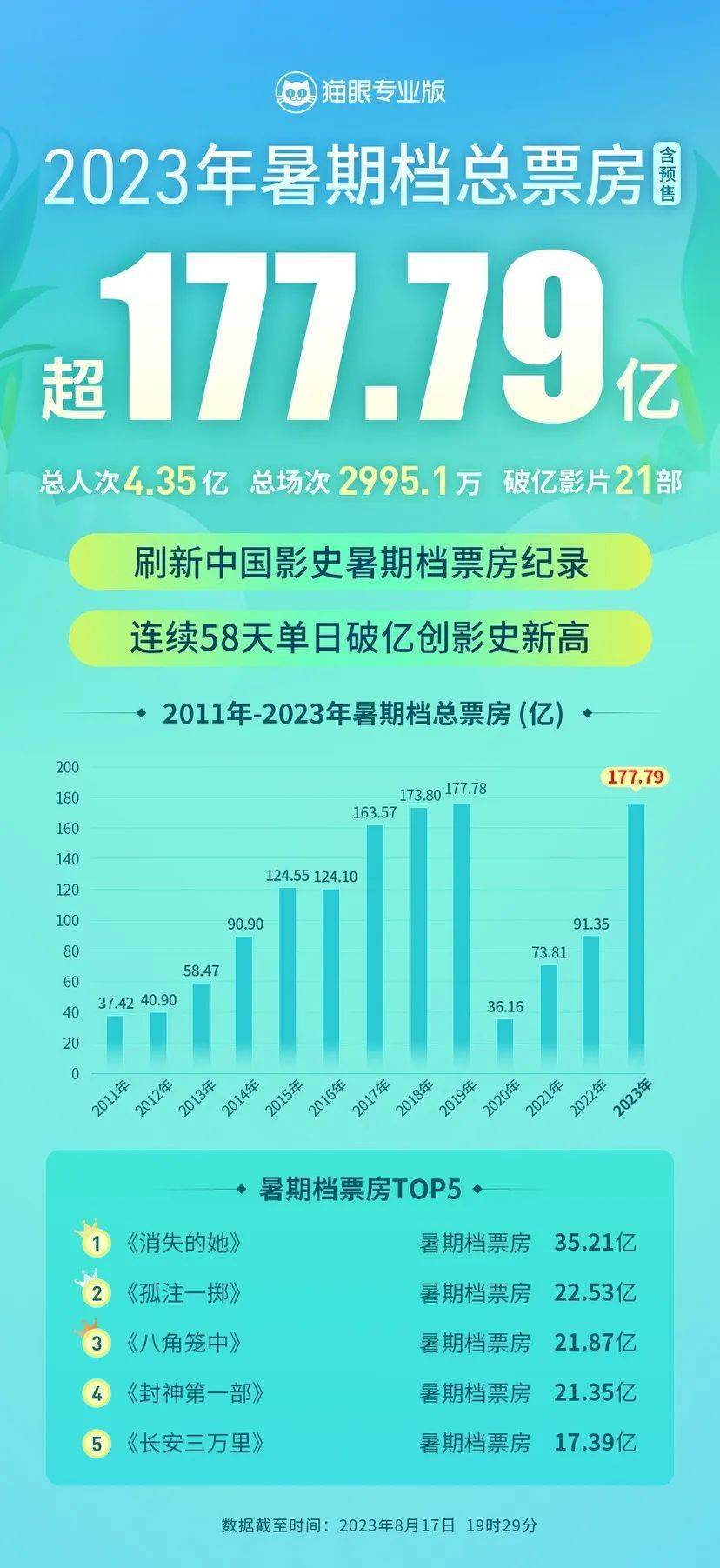 据猫眼专业版数据,截至8月17日19时29分,2023年暑期档总票房超177.79亿,刷新中国影史暑期档票房纪录。暂列2023年暑期档票房榜前五名影片分别为:《消失的她》35.21亿,《孤注一掷》22.53亿,《八角笼中》21.87亿,《封神第一部》21.35亿,《长安三万里》17.39亿。