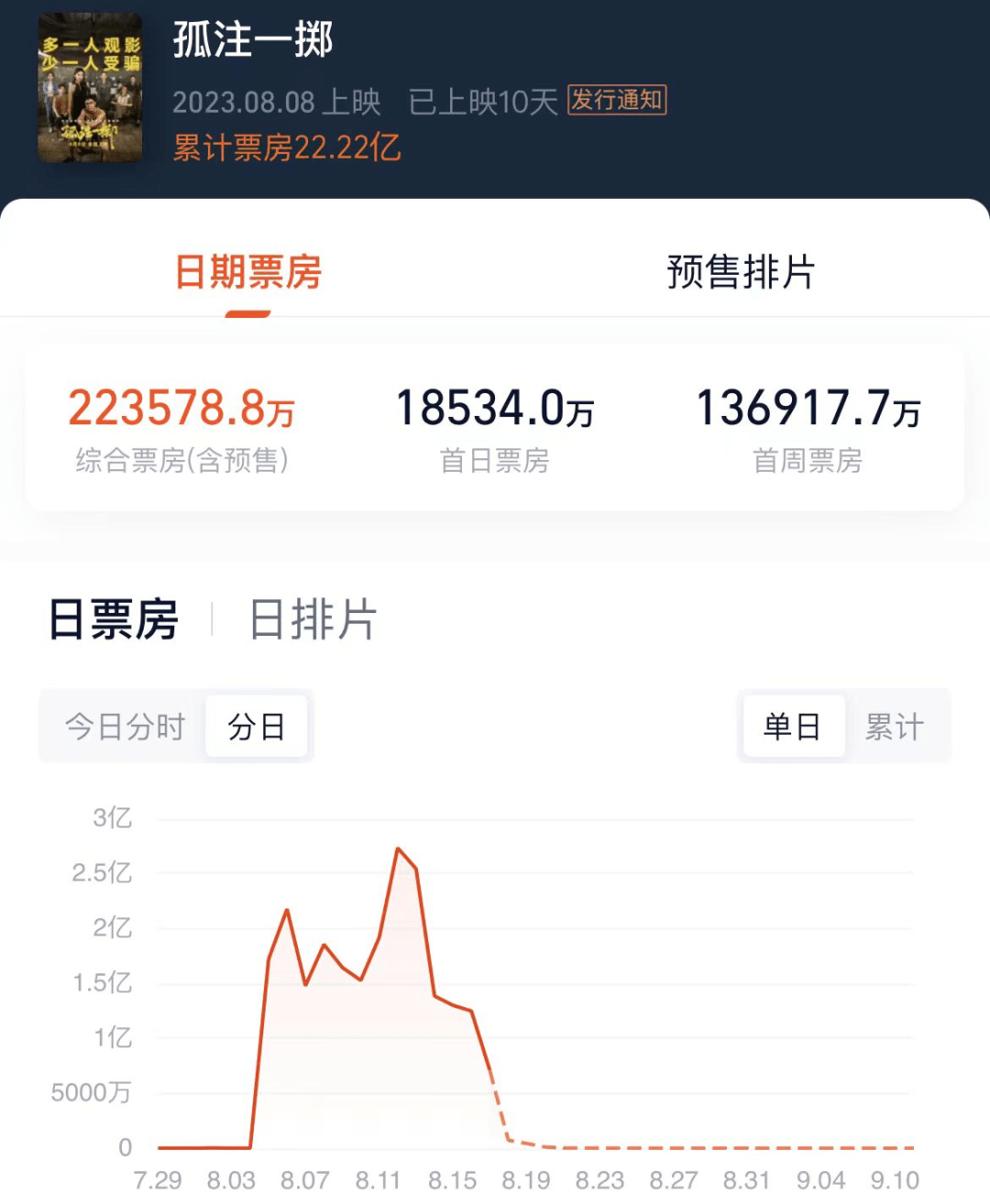 抖音爆火加上电影提前大规模点映每日破亿的节奏,《孤注一掷》或许也是为了平息“破坏点映规则”的舆论风波选择了提档8月8日上映,随后电影便开启了收割暑期档的节奏。