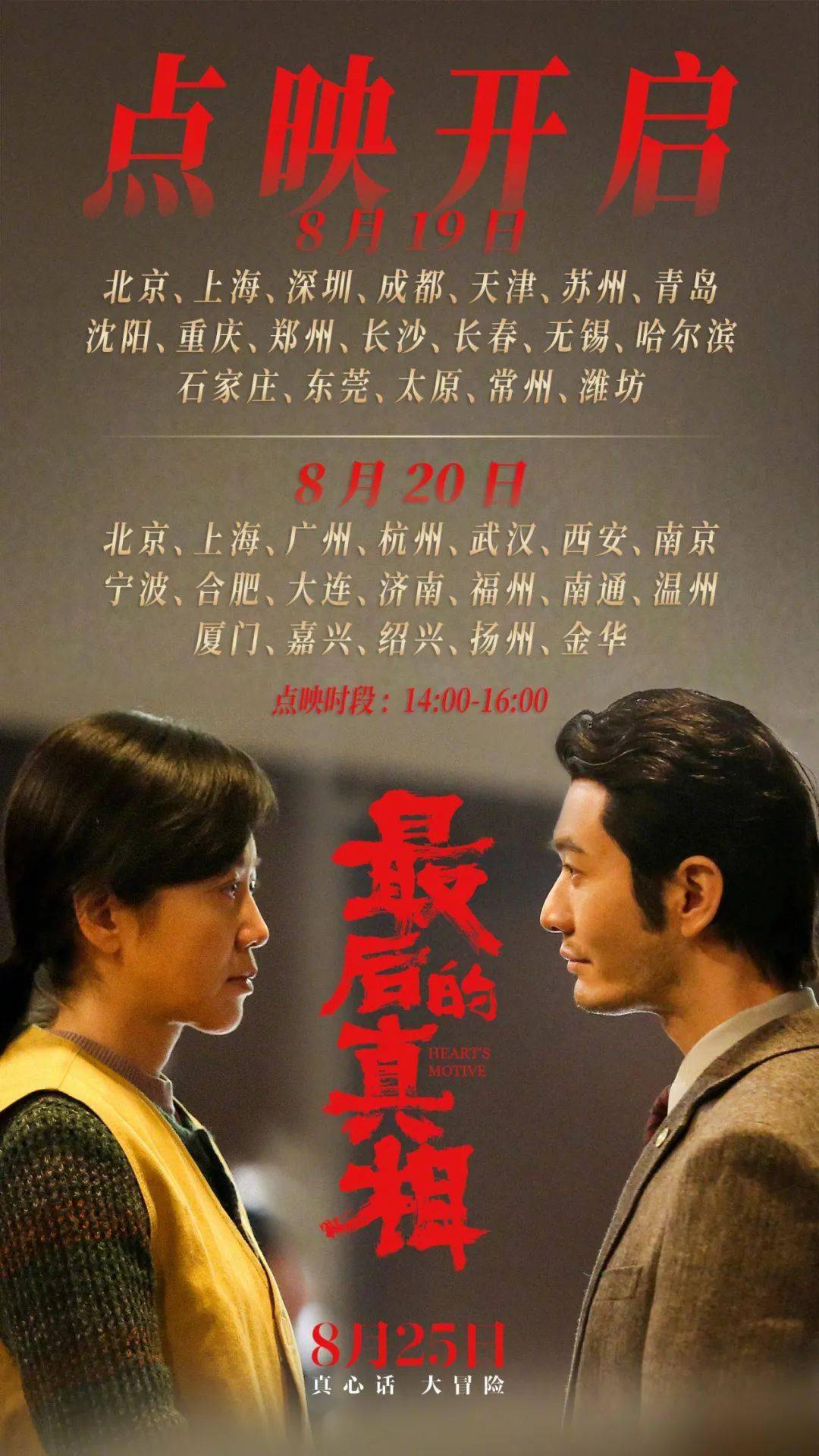 由黄晓明监制,李太阁执导的电影《最后的真相》宣布点映开启,将在本周末8月19、20日进行点映。8月25日正式上映。