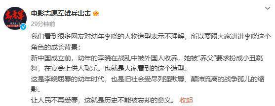 对此,电影《志愿军:雄兵出击》官方回应介绍该角色的成长背景并表明用意称:“新中国成立前,幼年的李晓在战乱中被外国人收养,她被“养父”要求扮成小丑跳舞,在宴会上供人取乐。也就是大家看到的这个造型。这是李晓屈辱的幼年时代,也是旧社会受尽列强欺辱、颠沛流离的战争孤儿的缩影。让人民不再受辱,这就是历史不能被忘却的意义。”