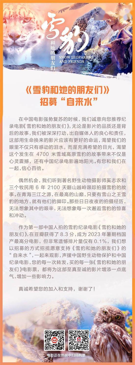 更加重要的是,《雪豹和她的朋友们》同样满怀期待,诚挚招募热爱电影的观众,共同成为“自来水”,涓涓细流,汇聚成川,助力中国野生动物保护,助力中国纪录电影发光发热。