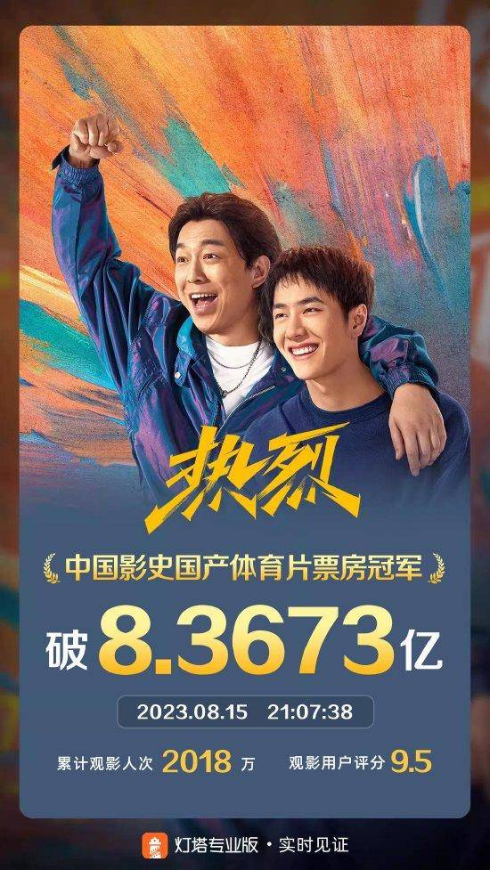 搜狐娱乐讯 8月15日,据灯塔专业版实时数据,影片《热烈》票房突破8.3673亿,超过影片《夺冠》票房,成为中国影史国产体育片票房冠军!本片由大鹏执导,黄渤、王一博领衔主演,正在热映中。