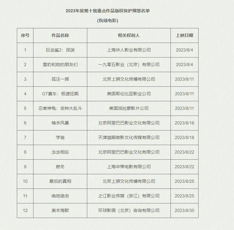 1905电影网讯日前,2023年度第十批重点作品版权保护预警名单发布,共有12部院线电影,包括8部国产电影及4部进口片:。