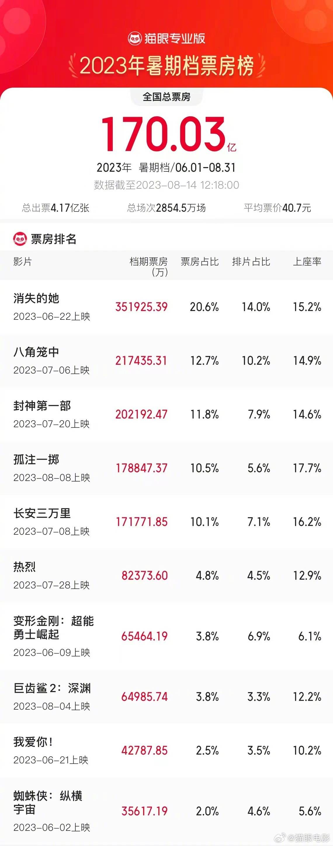 原标题:2023年暑期档总票房破170亿 《消失的她》《八角笼中》《封神第一部》稳居前三