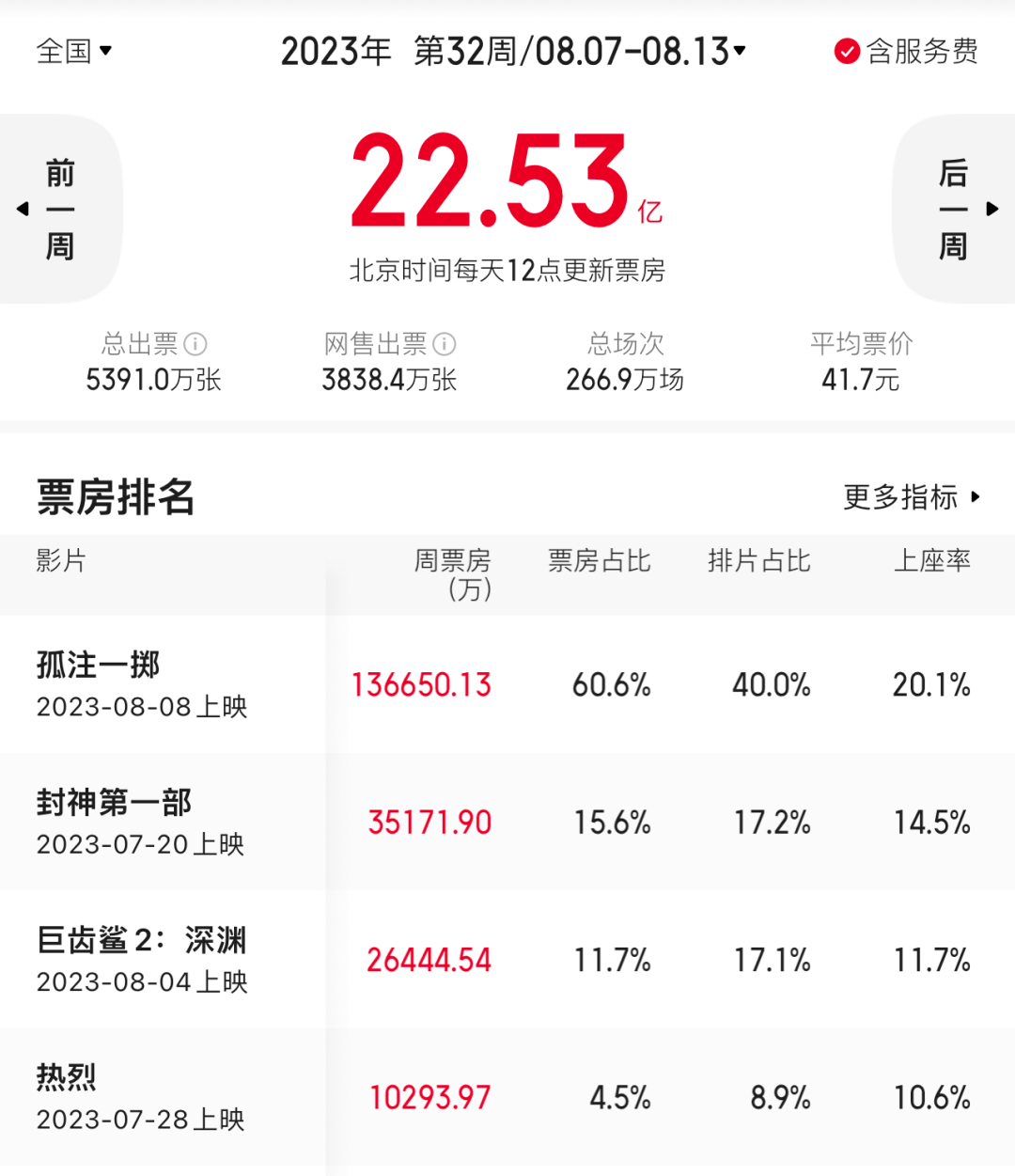 这一周(8月7日~13日)内地电影市场大盘报收22.53亿元,《孤注一掷》单周收入13.66亿元,轻取周冠军。