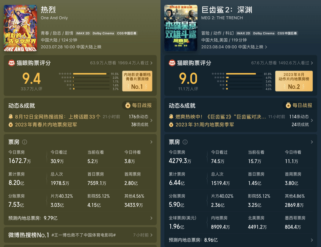 《巨齿鲨2》《热烈》在前一周(7月31日~8月6日)的猫眼专业版APP的预测中,都还是总票房破10亿的种子选手。经过上一周的市场竞争,两部影片的预测总票房都已经滑落到10亿元之下。