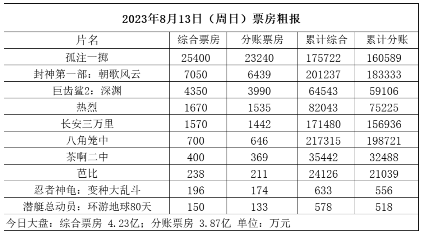 8月13日(周日),全国共排映39.2万场,观影人次约1000万,根据初步统计产出票房4.23亿。
