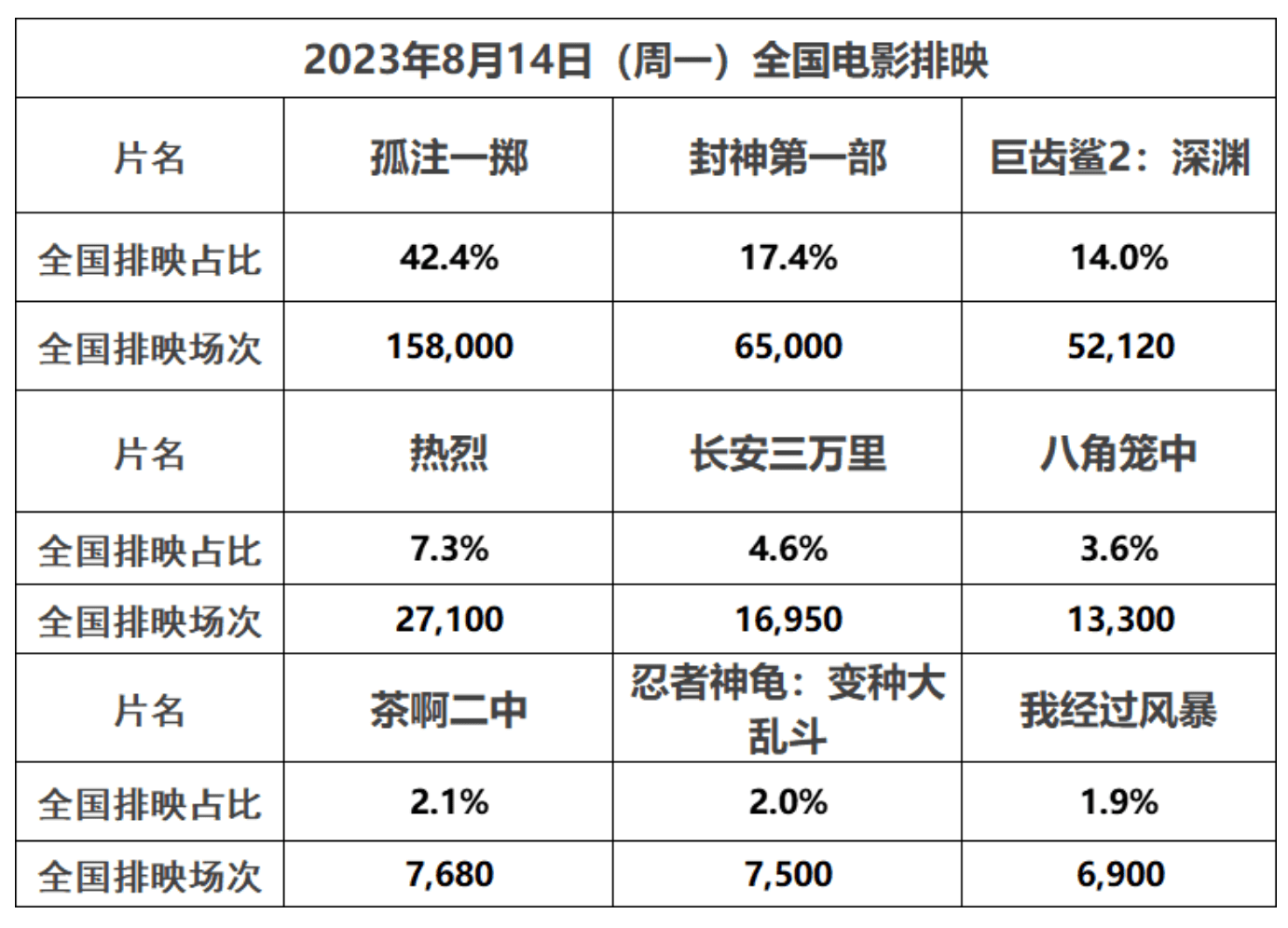 周一市场情况更新:《孤注一掷》单日排映占比42.4%,单日场次15.8万场稳居排片榜冠军。《封神第一部》当日排映占比仍接近17%,跟前几天的差距不大,仍居排片榜亚军。科幻动作续集《巨齿鲨2:深渊》单日排映占比下滑至14%左右,仍居排片榜季军。《热烈》以7.3%的占比位列第四,老片《长安三万里》以4.6%的占比重返前五。